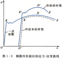 取一鋼筋對(duì)其施加拉應(yīng)力冷拉,鋼筋會(huì)發(fā)生變形(并作應(yīng)力——應(yīng)變圖)。隨著拉應(yīng)力增加,鋼筋內(nèi)部承受的拉應(yīng)力逐漸增大。當(dāng)鋼筋內(nèi)部產(chǎn)生的拉應(yīng)力超過鋼筋具有的屈服點(diǎn)A,而達(dá)到C后,停止冷拉,卸去荷載。此時(shí)可以看到,鋼筋已產(chǎn)生塑性變形,在卸荷過程中,應(yīng)力——應(yīng)變圖有一個(gè)變化,直線O1C比直線OA要緩。